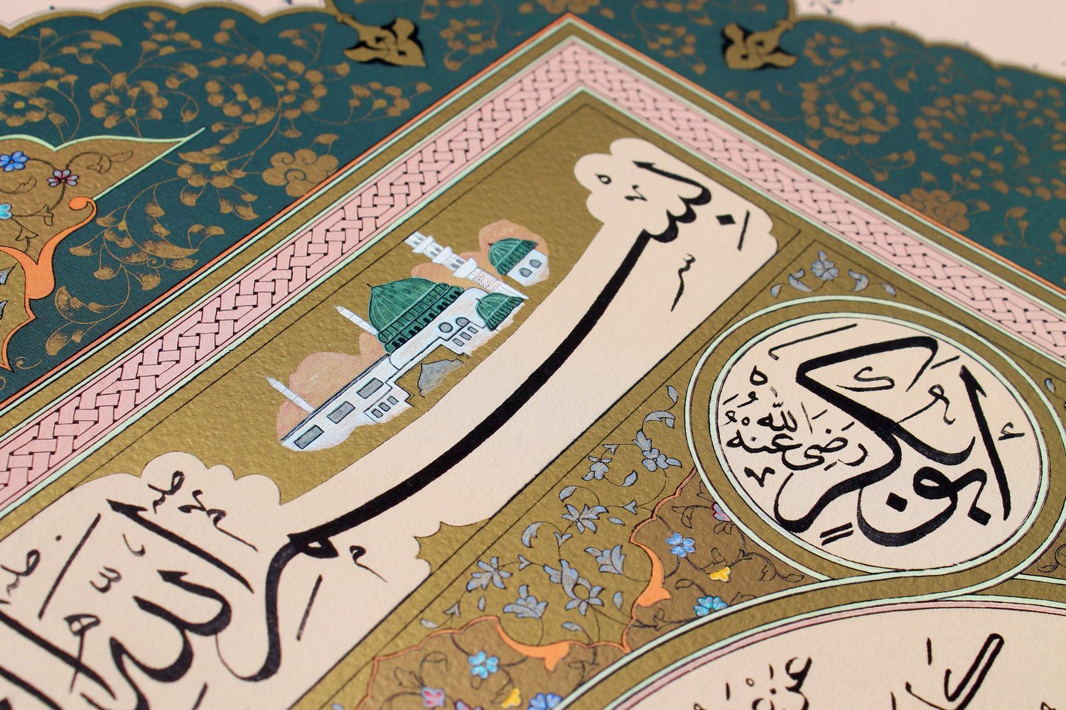 Calligraphy with physical description (hilya) of the Prophet Muhammad by Hasan Çelebi | Stunningly illuminated Islamic wall art
