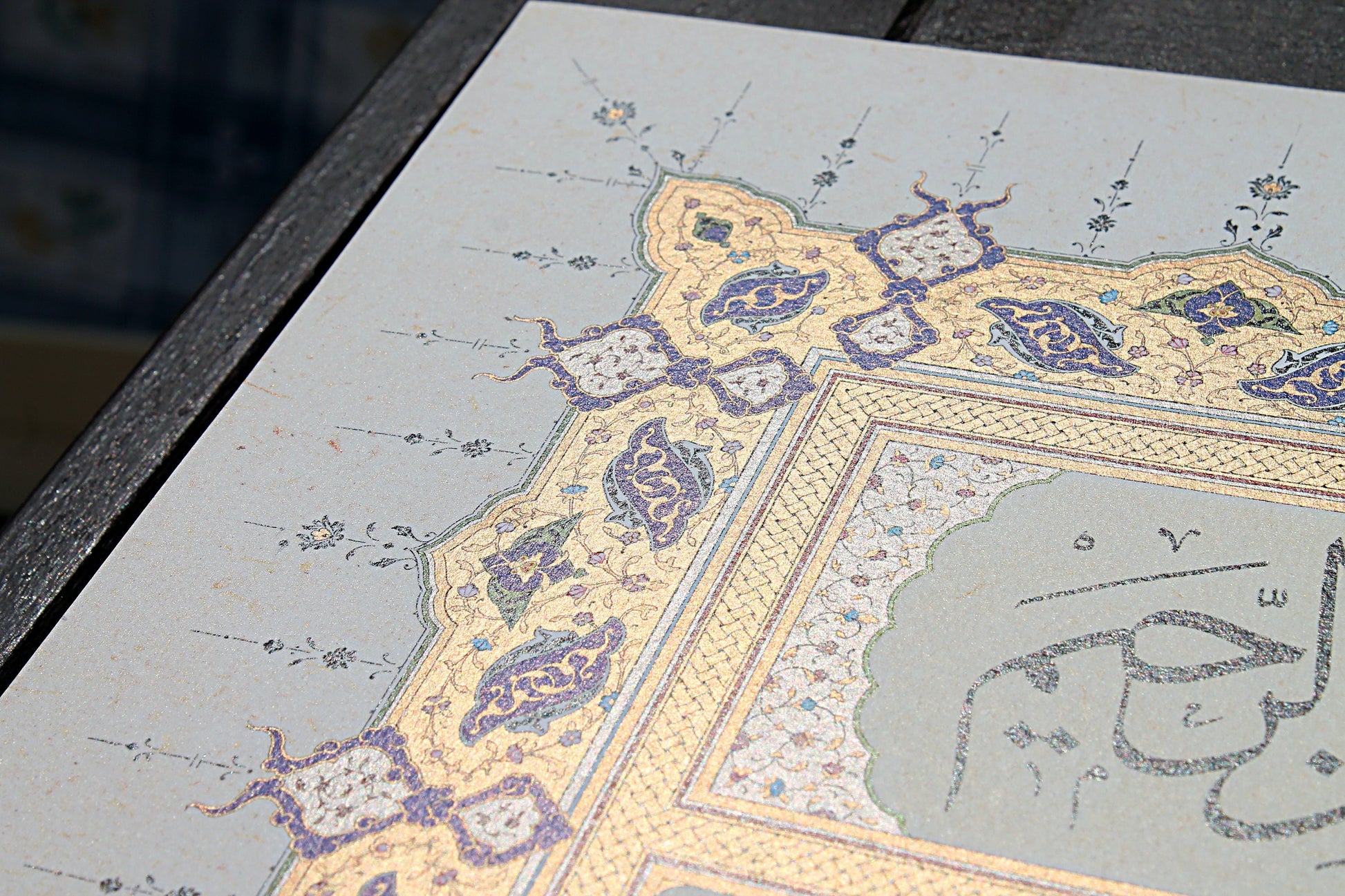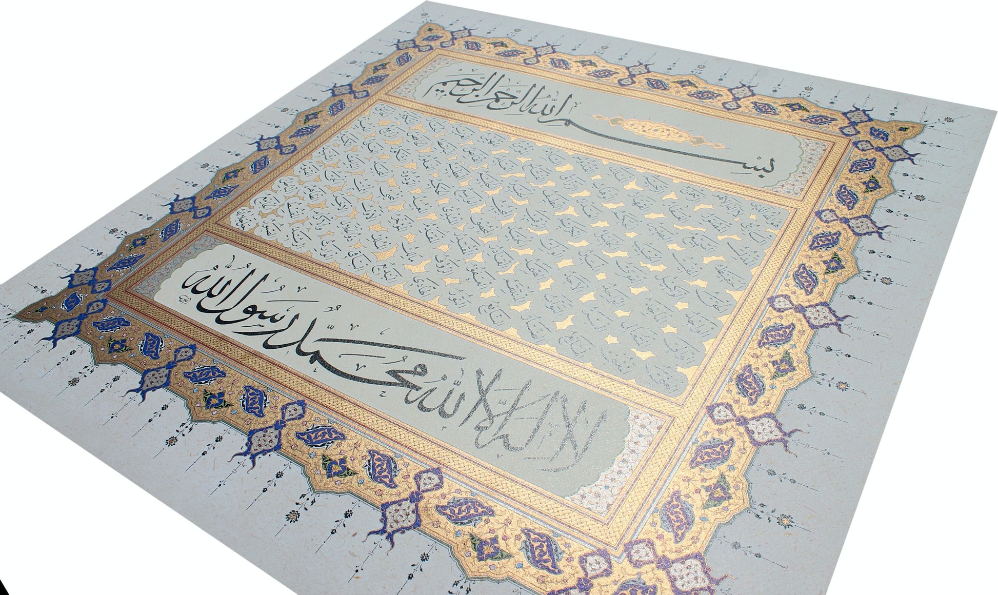 The main section has been gracefully composed in nesih script, gracefully framed at both the top and the bottom with the Basmala and Kalimat al-Tawhid in monumental sülüs. The entire piece is framed by strikingly illuminated floral patterns, which also feature in the main text sections.