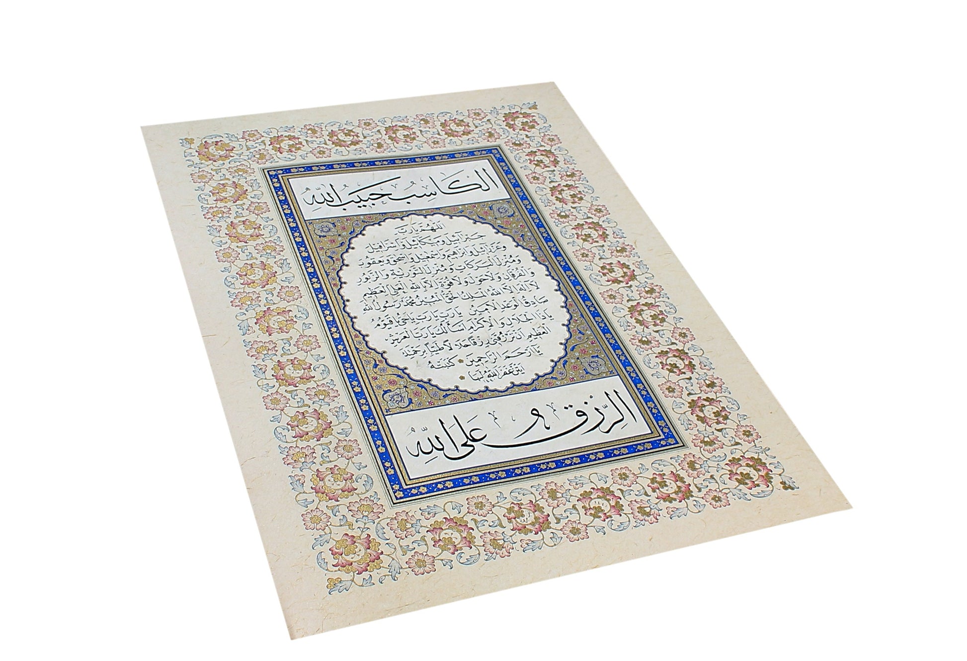 At the top of the composition is an important reminder from the hadith of the blessed Prophet, Peace be upon him, which praises a person who applies him/herself in earning a livelihood and providing their family: "The one who seeks their sustenance (al-kāsib) is a friend of Allah". This is paired with a further reminder below, "Sustenance (rizq) is from Allah", which reflects a central tenet of the Muslim faith.