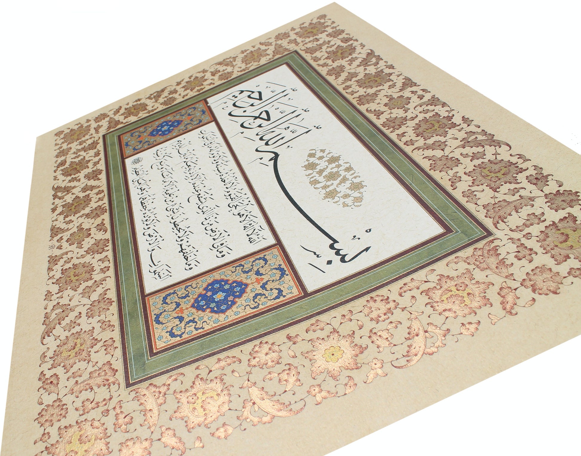 The verse is rendered in immaculate nesih script, with the Basmala inscribed above in elegant muhakkak. The composition is beautified further by the tezhip (illumination) in a dazzling array of colours, carefully executed by the acclaimed müzehhip Arda Çakmak.