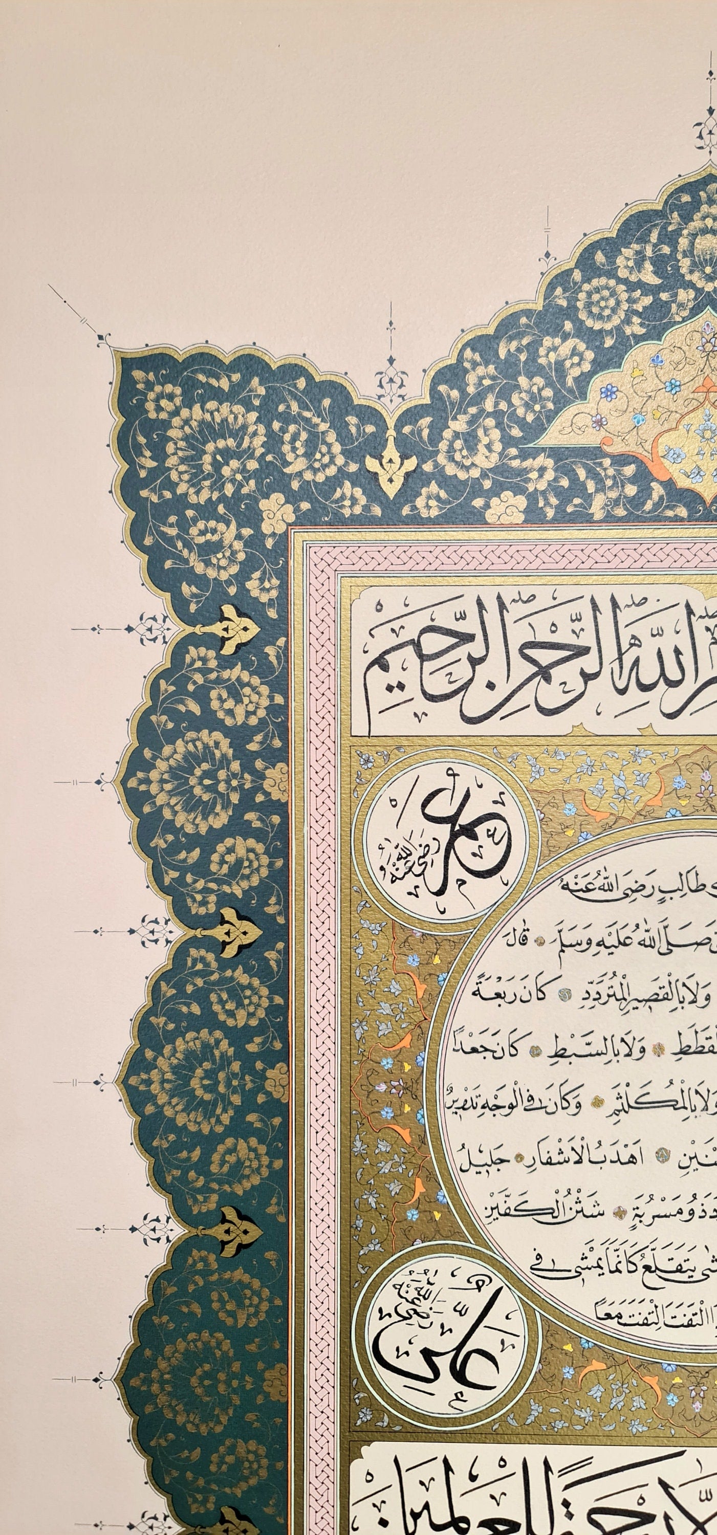 It has been elegantly inscribed by the renowned Turkish master calligrapher Hasan Çelebi, while the suitably dignified tezhip (illumination) has been executed jointly by Ayten Tiryaki and Şeyma Okur.