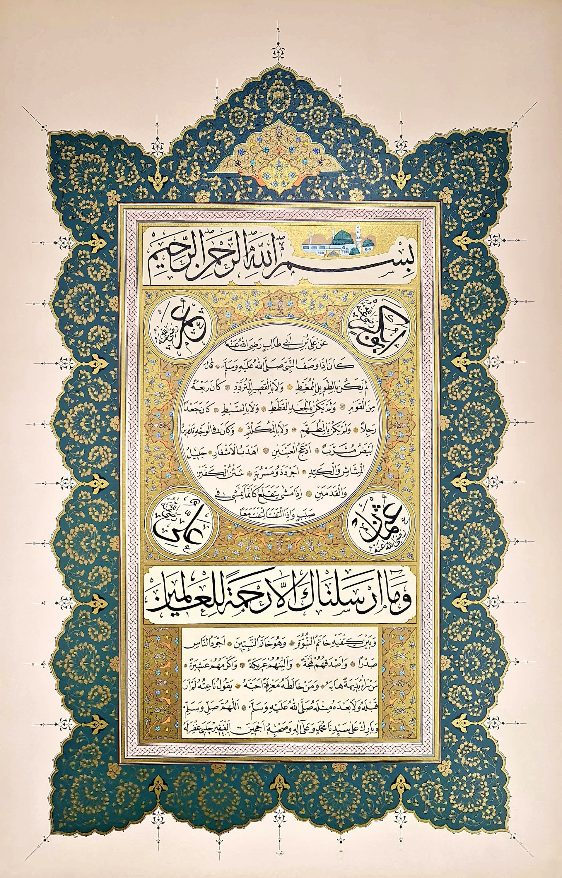 At the head of the work is the basmala, accompanied by a breathtaking illustration of the resting place of our master Muhammad ﷺ. The large, central roundel below contains a hadith from the collection of Imam al-Tirmidhi that has been narrated from Imam 'Ali (may God be pleased with him).