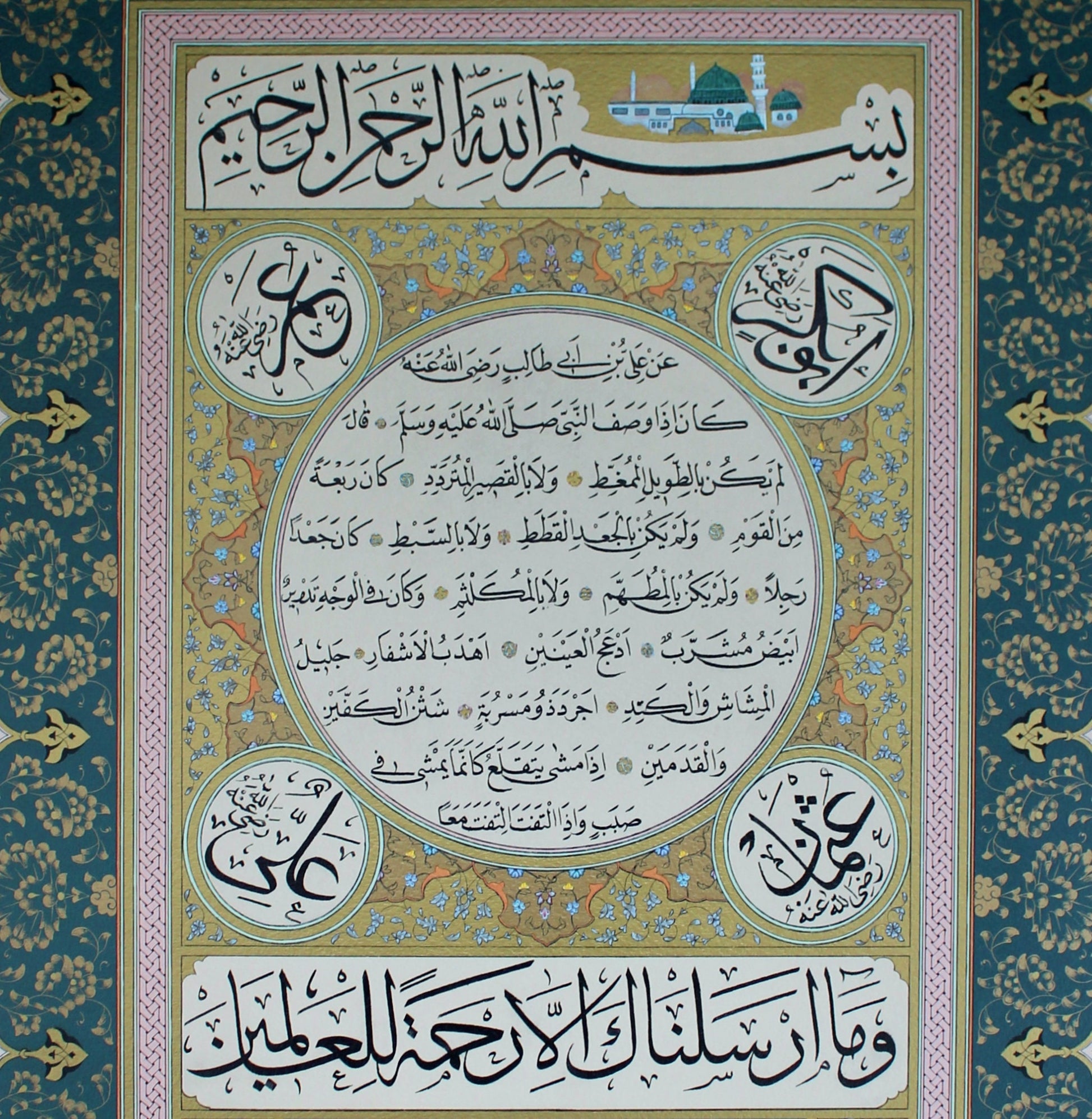Initially, the word ‘hilya’ (Turkish: Hilye) referred to the various hadith which describe the beautiful physical appearance and moral character of the Prophet Muhammad. Many of these are found in the ‘Kitab al-Shama’il’ of Imam al-Tirmidhi (died 279 AH/ 892 CE), which was the earliest collection of its kind.