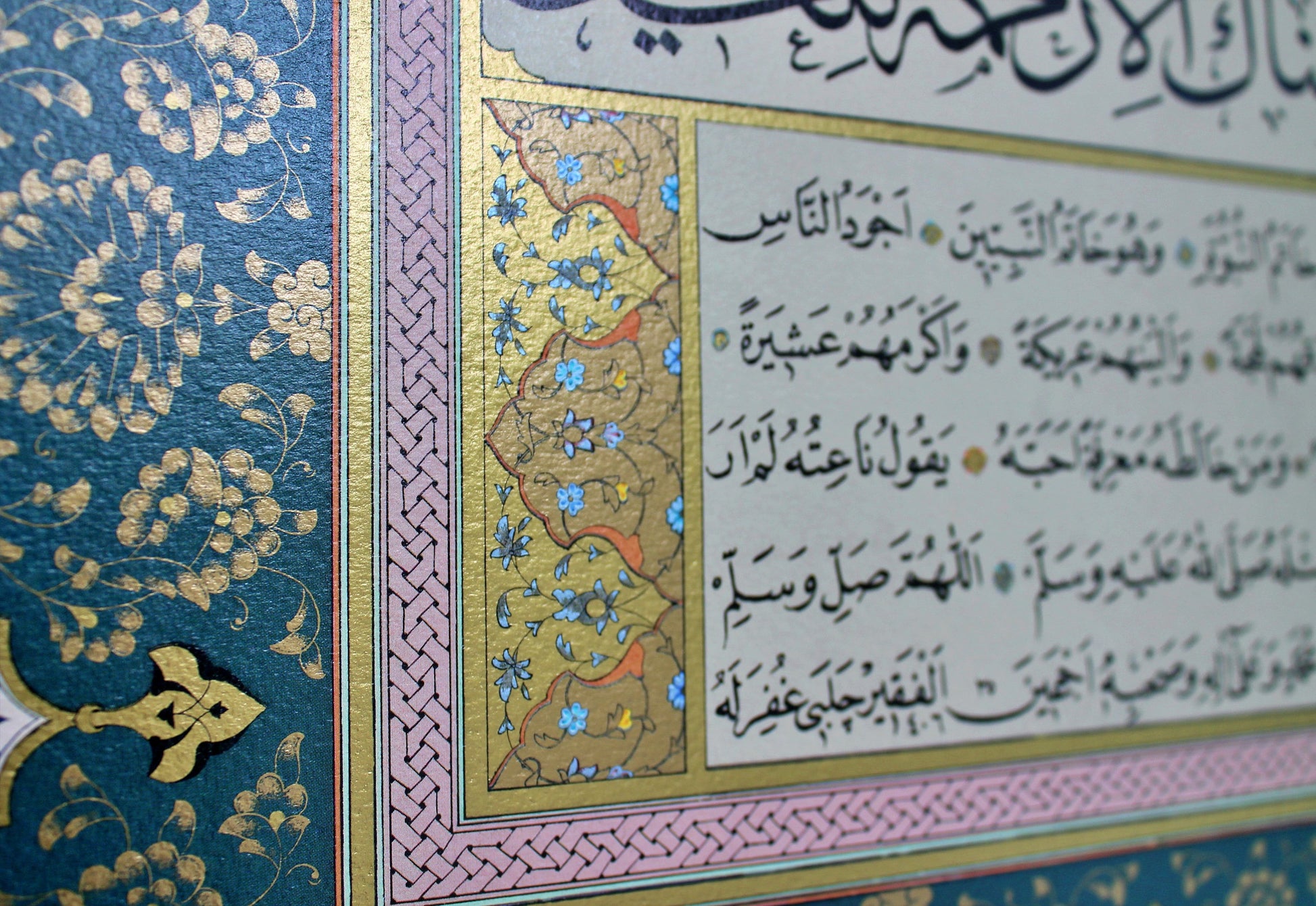 Born in 1937 in Erzurum, Hasan Çelebi is perhaps the most distinguished Turkish calligrapher of modern times, renowned for his style of classical Ottoman calligraphy. He studied with Hamid Aytaç, the last representative of the Ottoman school of calligraphy, from whom he received ijaza (license and authorisation to teach and practice) in Sülüs and Nesih after six years of study. He also obtained ijazah in Nasta'lik and Rik'a from the Turkish master calligrapher Kemal Batanay. Çelebi himself is the teacher of a number of notable calligraphers, including the müzehhip of the present piece, Ayten Tiryaki. He has restored calligraphic panels in prestigious locations around the world, including the Prophet's Mosque in Medina and the Sultanahmet Camii (Blue Mosque) in Istanbul. His own work can be found in mosques around the world. He is a member of the Muslim 500.