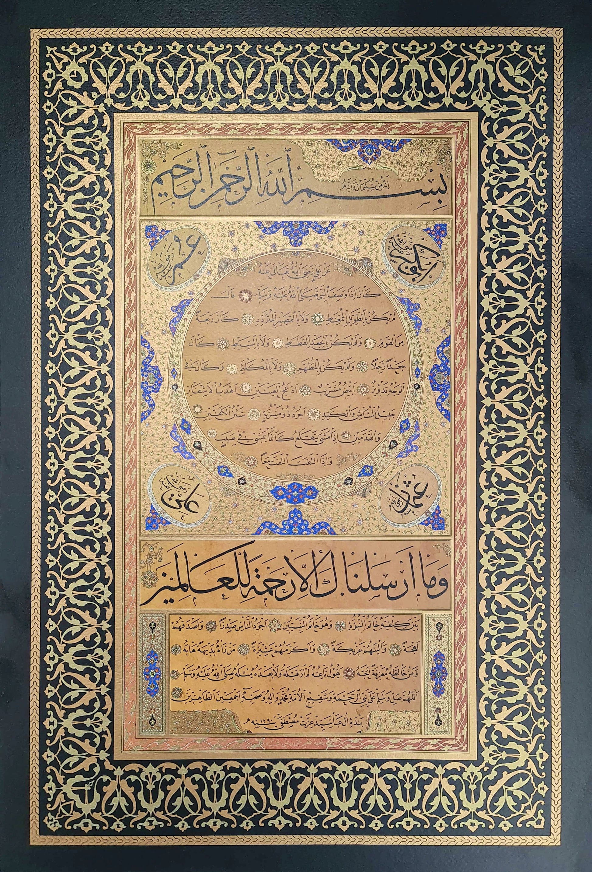 This stunning quality lithographic print reproduces a remarkable Ottoman-era hilye (verbal description) of the Prophet Muhammad ﷺ. The original piece was composed in elegant naskh script by the master calligrapher Kazasker Mustafa İzzet (1801-1876) in 1290 AH (1873-74 CE).